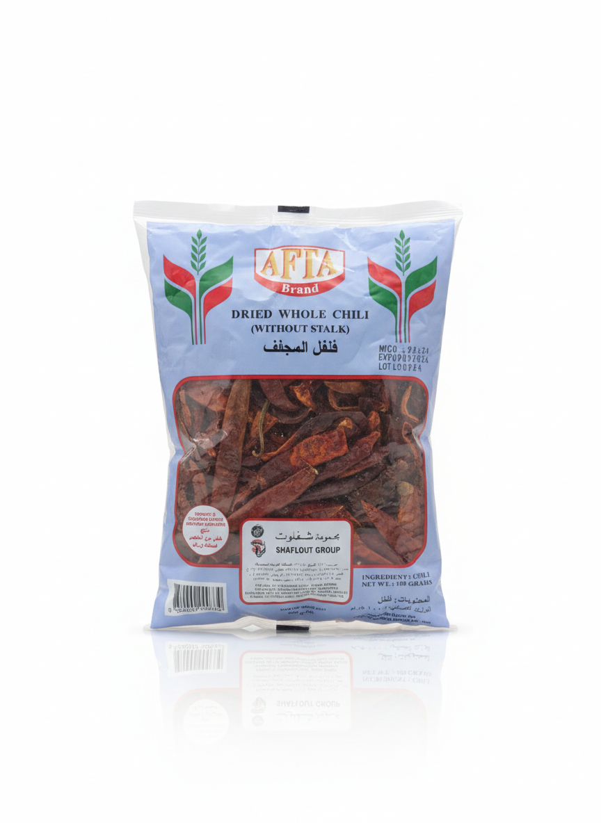 هذا المنتج هو فلفل أحمر مجفف كامل (بدون ساق) من العلامة التجارية أفتا.