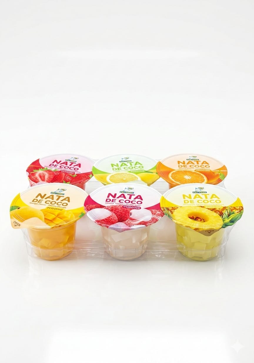 - عبارة عن حلوى جيلي بنكهات فواكه متنوعة تحتوي على قطع صغيرة من ناتا دي كوكو القابلة للمضغ.