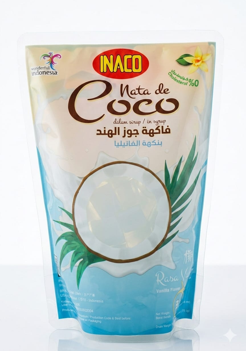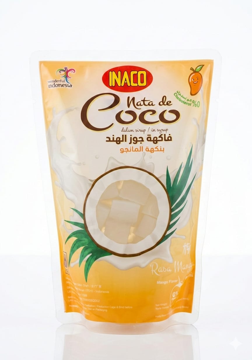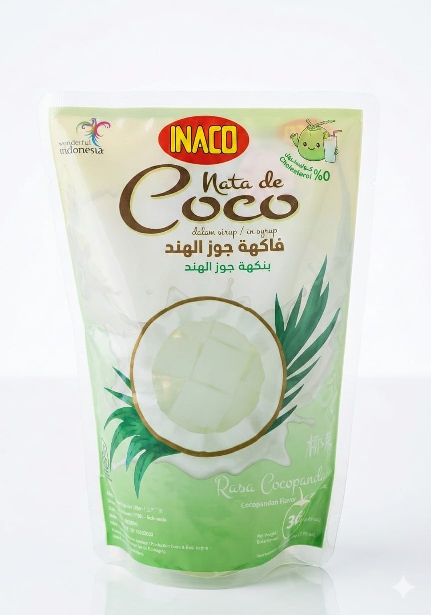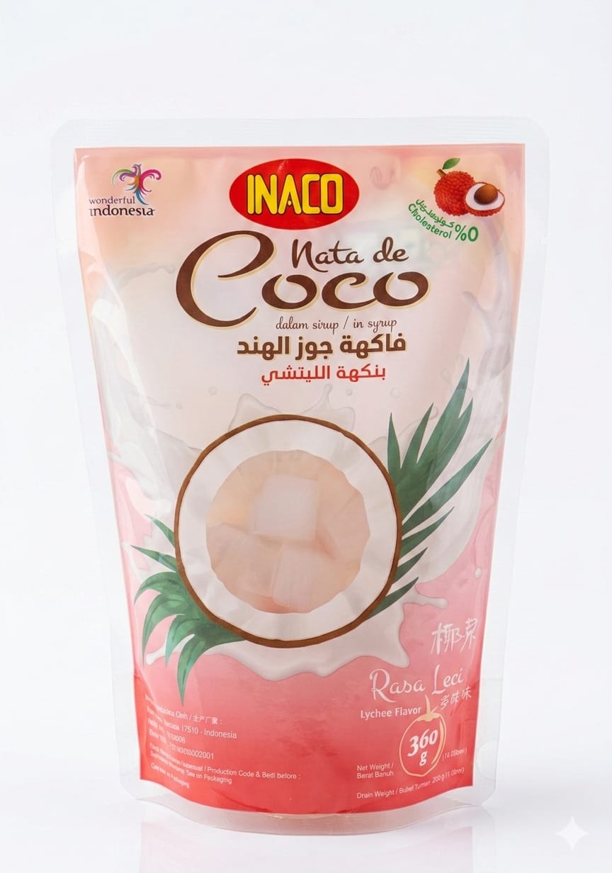 هذا المنتج هو Inaco Nata de Coco بنكهة الليتشي، وهو عبارة عن قطع هلامية من جوز الهند في شراب خفيف.