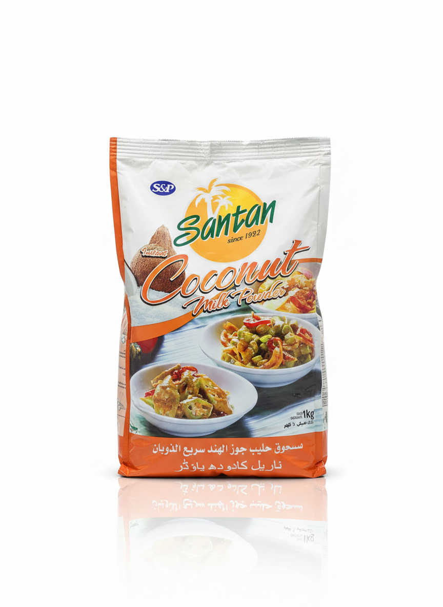 مسحوق حليب جوز الهند سريع الذوبان من علامة سانتان (S&P Santan) هو منتج غذائي يستخدم في الطهي وإعداد المشروبات.