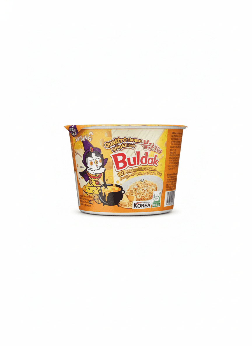 نودلز ساميانغ بولداك كواترو تشيز رامن هي نودلز كورية سريعة التحضير بنكهة الدجاج الحار ممزوجة بجبنة كريمية غنية من أربعة أنواع من الجبن. المنتج المعروض هو عبوة كوب كبير بوزن 110 جرام.